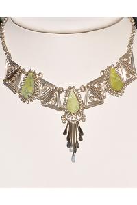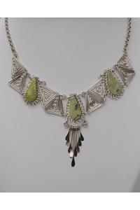 Joli collier en métal d'alpaca avec une réalisation des figures géométriques triangulaires et des pierres en serpentine.