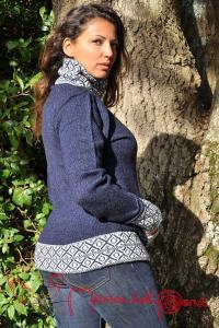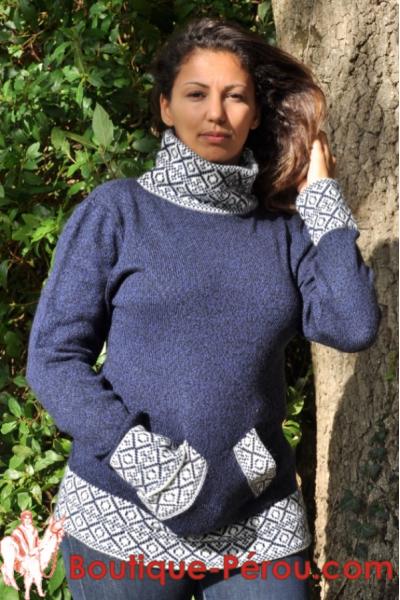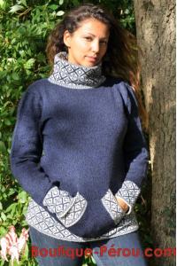 Pull péruvien femme, tricote avec de la fine fibre d'alpaga avec des dessins géométriques entourant le col, et la partie basse du pull.