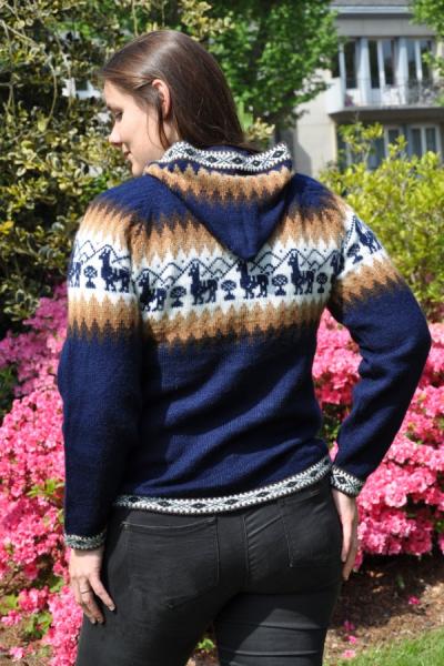 Pull bleu marine en laine d'alpaga pour femme avec capuche.
