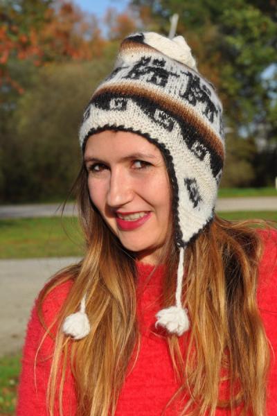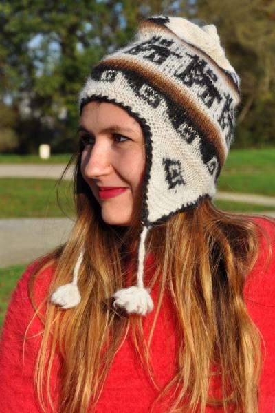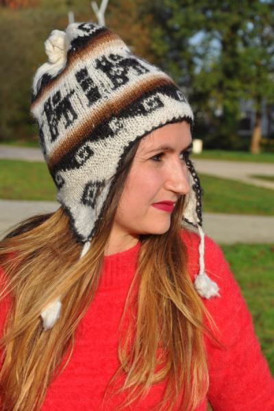 Chullo tricoté main en laine naturelle d'alpaga. Modèle unique.