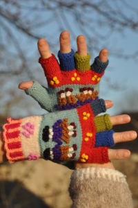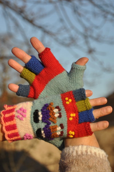 Chaque paire de gant est unique car elle sont tricotées à la main. Les coloris de laine sont légèrement différents pour chaque paire.