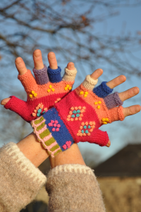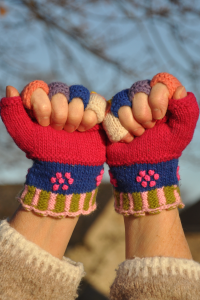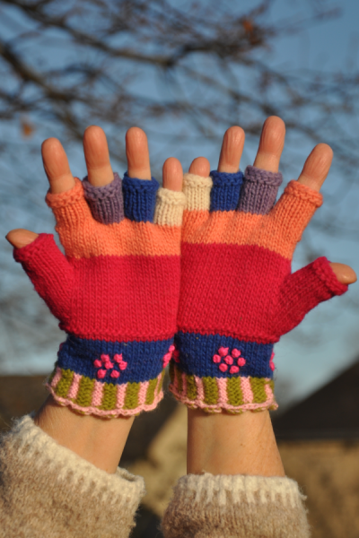 Ces très jolis gants-mitaines sont tricotés à la main avec une laine mérinos.