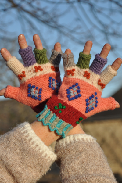 Ces très jolis gants-mitaines sont tricotés à la main avec une laine mérinos.
