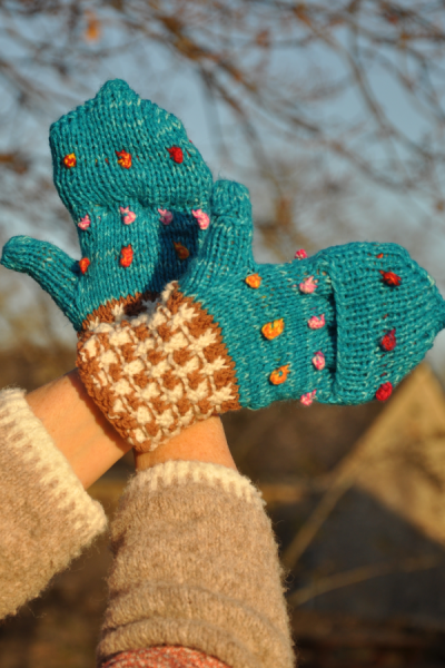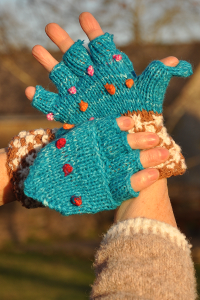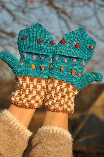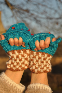 Ces très jolis moufles-mitaines sont tricotés à la main avec une laine mérinos.