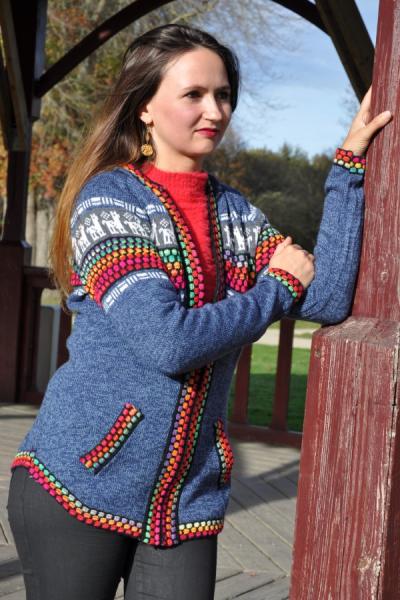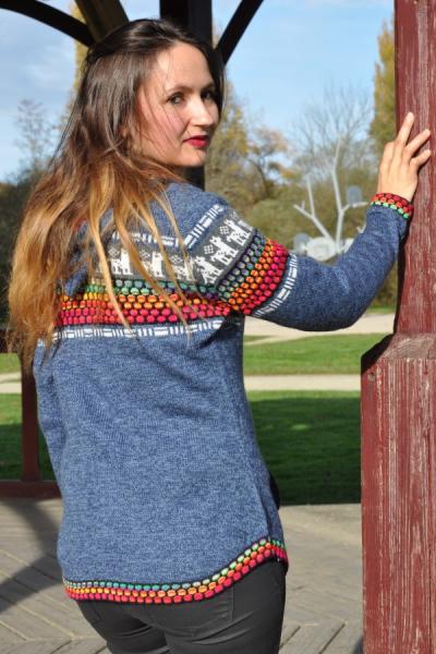 Gilet péruvien pour dame en laine d'alpaga de couleur gris bleu avec des dessins typiques et colorés.