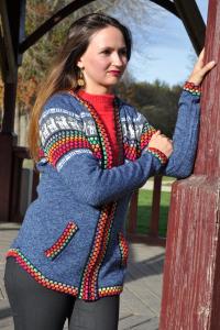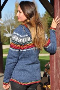Gilet péruvien en laine d’alpaga gris bleu avec fermeture éclair, orné de motifs andins colorés pour un style unique et authentique.