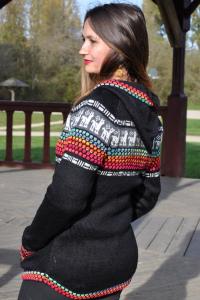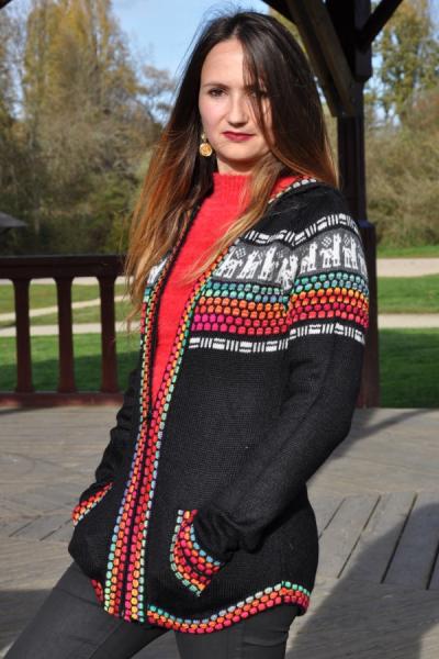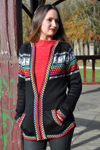 Gilet péruvien pour dame en laine d'alpaga de couleur noir avec des dessins typiques.