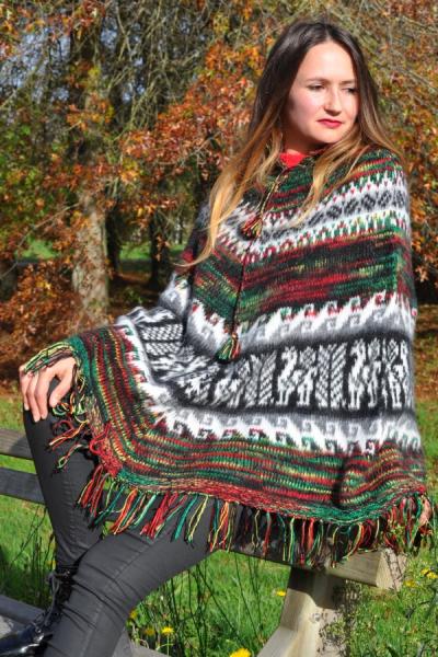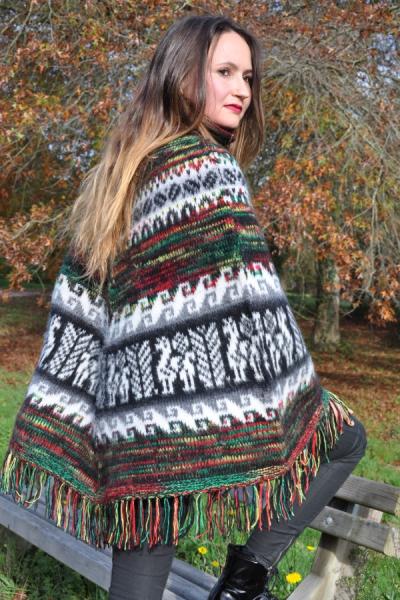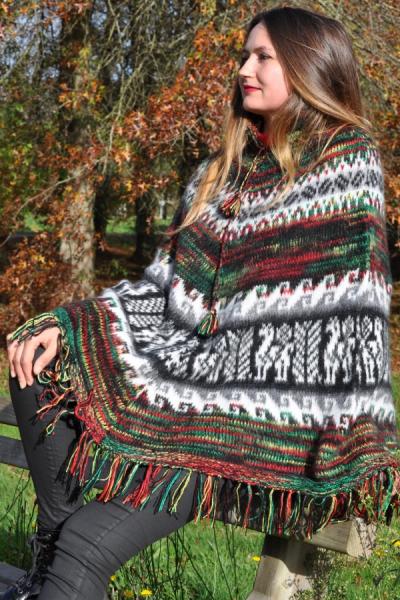 Elegant poncho femme léger et chaud, fermeture avec col à lacets pour une meilleur tenue, poncho de couleur vert chiné en laine d'alpaga.