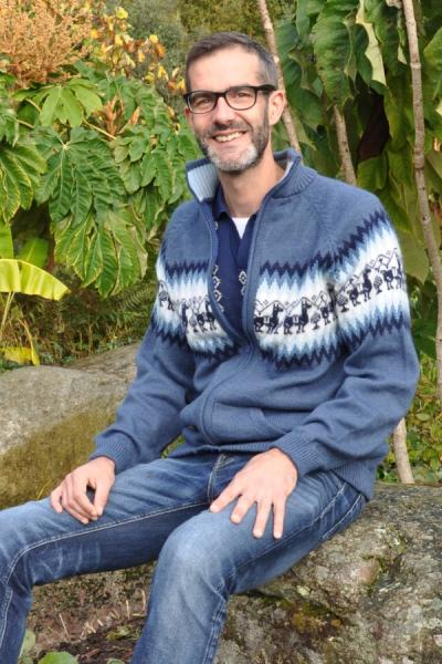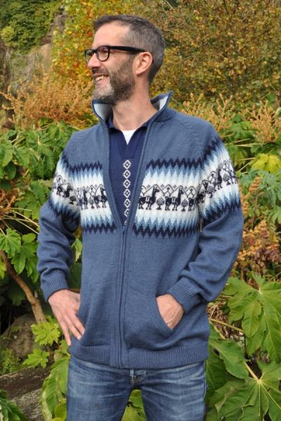 Tricot beige en laine d'alpaga avec capuche et aux motifs typiques péruvien : montagnes et lamas.