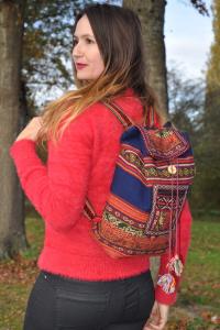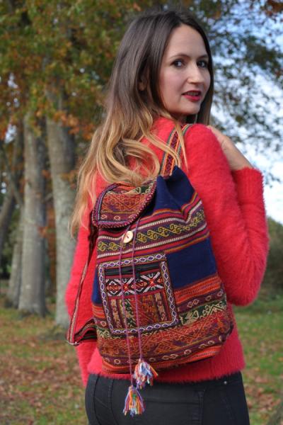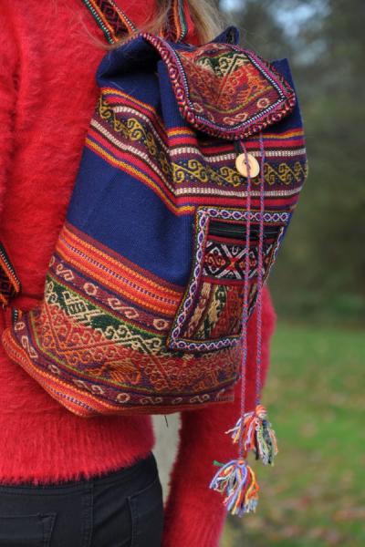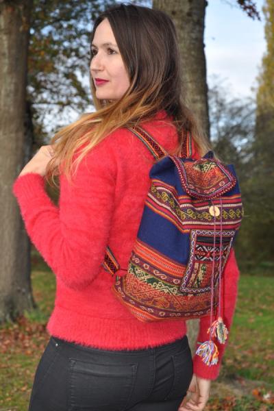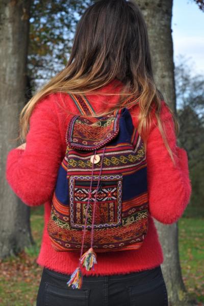 Sac à dos en cuir et tissage Aguayo. Mochila en cuero i aguayo de los Incas. Pièce unique